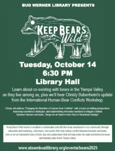 Keep Bears Wild is hosting a talk about co-existing with bears in the Yampa Valley. It’s at 6:30 p.m. Tuesday, Oct. 14 I Library Hall at Bud Werner Memorial Library. Christy Bubenheim will also have an update from the International Human-Bear Conflicts Workshop.
