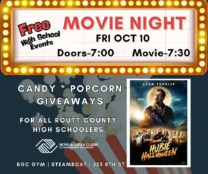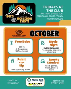 Here’s some of the fun happening Fridays at the Club with the Boys & Girls Club of Steamboat Springs. It’s from 7-10 p.m. and it’s free fun open to all Routt County high school students. The Boys & Girls Club is at 325 8th Street in Steamboat Springs. Find out more at BGCNWC.org or call 970-871-3160.