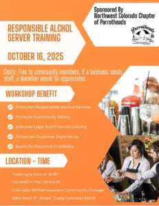 Training for Responsible Alcohol Servers is Thursday, Oct. 16, in Craig. This is free to community members, although donations are appreciated from local businesses participating. The workshop training promotes responsible alcohol service, protects community safety, reduces legal and financial liability, enhances customer experience, and builds professional credibility. It is from 6-8 p.m. Thursday, in the library at Colorado Northwestern Community College in Craig. The Responsible Alcohol Server Training is sponsored by the Northwest Colorado Chapter of Parrotheads.