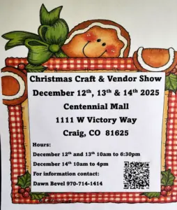 The Christmas Craft and Vendor Show is at Centennial Mall in Craig, Dec. 12-14. Hours are 10 a.m. to 6:30 p.m. on Friday and Saturday, and then 10 a.m. to 4 p.m. Sunday. For more information, contact Dawn Bevel at 970-714-1414.