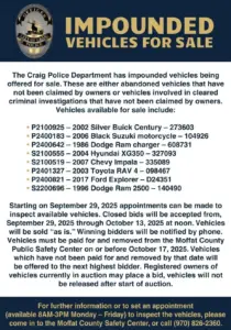 The Craig Police Department has released a list of eight vehicles that have been impounded and are now for sale. Some haven’t been claimed after a criminal investigation and others have been abandoned. The vehicles range from a motorcycle to cars, trucks, and SUVs, as old as 1986 and as new as 2017. As of today, Sept. 29, you can make an appointment to inspect the vehicles that are available and then make a big anytime between now and Oct. 13. All vehicles are sold “as is.” Call the Moffat County Safety Center at 970-826-2360 to set up an appointment.