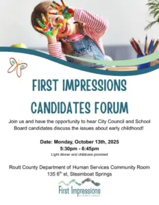 Meet the city council and school board candidates today in a Candidates Forum, hosted by First Impressions. It starts at 5:30 p.m. in the Routt County Community Room at 135 6th Street in Steamboat Springs. They’ll be asked to share views on issues that impact young children, families, and early childhood education in Routt County. A light dinner and childcare will be provided.