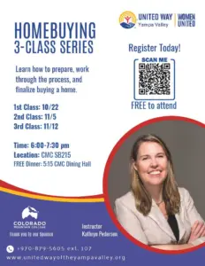 Women United and United Way of the Yampa Valley are hosting a Homebuying 3-Class Series, on Oct. 22, Nov. 5, and Nov. 12. Learn how to prepare, work through the process, and finalize buying a home. Classes are from 6-7:30 p.m. in SB215 at Colorado Mountain College. Free dinner starts at 5:15 p.m. To register, call 970-879-5605, ext. 107, or find out more at UnitedWayoftheYampaValley.org