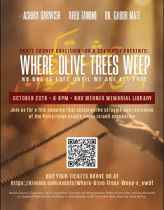 Join Routt County Coalition for a Ceasefire in a night of education and community for a film screening of “Where Olive Trees Weep” from 6-8 p.m. at Bud Werner’s Library Hall Monday, Oct. 20. The screening is open to anyone interested in learning more about the Palestinian struggle. Routt County Coalition for a Ceasefire’s portion of the proceeds from ticket sales will be donated to support Palestinian families impacted in partnership with Ceasefire Now Roaring Fork Valley. Tickets are $4 and available HERE