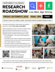 The Northwest Colorado Research Roadshow is Friday, Oct. 17, complete with an inflatable colon tunnel. It’s to help teach about polyps and the importance of getting screened to find cancer early. The Research Roadshow is a free community event designed for older adults, to learn how to live well and age strong through research. Topics include mobility, healthy brain aging, cancer prevention, and research for veterans. There will also be activities. A light lunch is included. The event is from 10 a.m. to 2 p.m. at UCHealth Yampa Valley Medical Center.