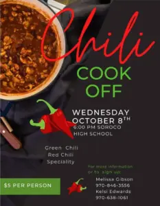 The Chili Cookoff at SoRoCo High School is at 6 pm. Wednesday, Oct. 8. It’s $5 per person to try green chili, red chili, and specialty chili. Information to sign up is on our website.