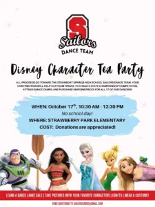 The Steamboat Sailors Dance Team is hosting a Disney Character Tea Party from 10:30 a.m. to 12:30 p.m. on Friday, Oct. 17 because there is no school that day. It is at Strawberry Park Elementary. Kids can dress up, learn a dance, do some crafts, and take pictures with their favorite characters. Donations are accepted to help the dance team with expenses for uniforms and for travel to CHSAA’s State Championship Competition.