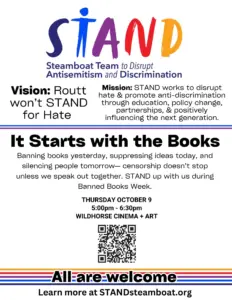 STAND, which is Steamboat Team to Disrupt Antisemitism and Discrimination is hosting a gathering from 5-6 p.m. Thursday, Oct. 9, at Wildhorse Cinema. The theme is “It Starts with the Books.” Students from the Social Justice Club at Steamboat Springs High School will be there. Everyone is welcome. Learn more at StandSteamboat.org