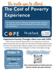You’re invited to learning about “The Cost of Poverty Experience,” or COPE. It’s an immersive simulation that gives a glimpse into the lives of low-income individuals and families in our community. The event is also hosted by the Health Partnership. It starts at 9:30 a.m. Tuesday, Oct. 14, at Steamboat Christian Center, and it includes lunch.