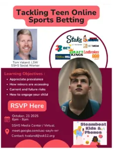 You’re invited to a free workshop, “Tackling Teen Online Sports Gambling.” It’s from 6-8 p.m. Tuesday, Oct. 21, in the Media Center at Steamboat Springs High School. Dinner will be provided from the SSHS PIC. “This workshop aims to inform caregivers regarding the prevalence of online gambling amongst teens, how minors are accessing online platforms that are supposed to be for adults (18+), the potential risks to your teen’s mental and financial well-being and how to engage them on the topic.” For more information, or to RSVP, email Tom Valand (tvaland@ssk12.org).