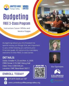 Women United of United Way of the Yampa Valley is offering a free 3-Class Program about budgeting. Dates are Oct. 9, Oct. 23, and Nov. 6. The class is from 6-8 p.m. in the dining room at Colorado Mountain College in Steamboat. A free dinner is at 5:15 p.m. Enroll by calling 970-879-5605 or visit UnitedWayoftheYampaValley.org