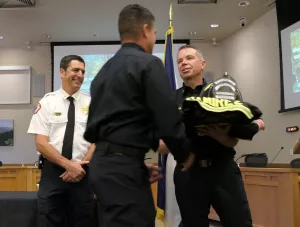 Nick Fernandez was also honored with a promotion to Firefighter/Engineer. In his new engineer role, Fernandez will be responsible for maintaining and driving apparatus that transport firefighters, carry equipment, and pump water at fire scenes. A specific department certification to operate firefighting equipment is required, which mandates specific training, experience, and testing on the apparatus.