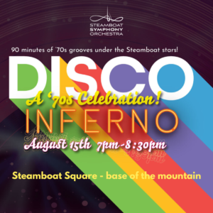 Also Thursday night, the Steamboat Symphony Orchestra presents Disco Inferno – a 70s Celebration! at the base of Steamboat Resort. It starts at 7 p.m. tonight and it is free, but there is a suggested donation of $20, if you can. New York’s top performers will be singing and dancing to hits by Abba, the Bee Gees, Gloria Gaynor, Elton John, Donna Summer, and more. Ninety minutes of ‘70s grooves under the Steamboat stars!