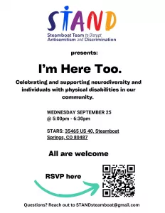 STAND, which stands for Steamboat Team to Disrupt Anti-Semitism and Discrimination is hosting a public gathering called, “I’m Here, too.” It’s at 5:30 p.m. Wednesday, Sept. 25, in the Great Room at STARS, 35465 US Hwy 40 in Steamboat Springs. The focus is on witnessing stories and experiences of individuals in our community with special needs and neurodiversity. All are invited.