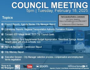 Steamboat Springs City Council meets tonight.  Agenda items include reports from the Parks & Recreation Commission and the City Attorney. Council will also go into Executive Session to work on the selection process for City Manager, as well as compensation and employment terms for the person hired.
