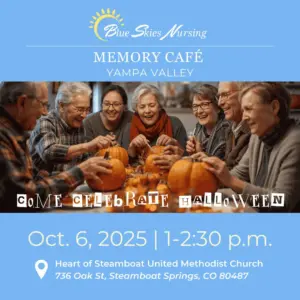 Blue Skies Nursing is hosting a Memory Café of the Yampa Valley. It’s for those with memory loss, and their caregivers, for some Halloween Fun today, at 1 p.m. at Heart of Steamboat United Methodist Church at 8th and Oak. It’s free but preregister to attend through BlueSkiesNursing.com
