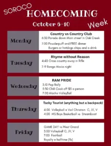 It is Homecoming Week for the SoRoCo Rams. There is a parade down Main Street in Oak Creek at 6:30 tonight. The theme is Country vs. Country Club. Then there is a Powderpuff football game at 7 p.m. with a free dinner. The Homecoming game this Friday night is against West Grand at 7 p.m.