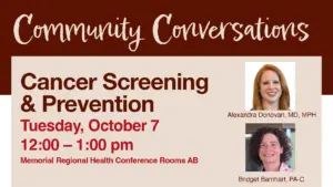 Cancer Screening and Prevention is the topic for the next Community Conversation series at Memorial Regional Health in Craig. It’s at noon on Tuesday, Oct. 7, in the MRH conference rooms. Alexandra Donovan and Bridget Barnhart are the speakers, who will discuss prevention and early detection of cancer, as well as local oncology services that are available.