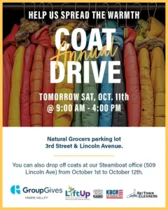 Thinking ahead to this Saturday… GroupGives of the Yampa Valley is coordinating their annual Coat Drive. They’re collecting “like new” winter coats for LiftUp, which will later be distributed to those who need some extra winter warmth. Look for GroupGives vans in the parking lot at Natural Grocers, from 9 a.m. to 4 p.m. this Saturday, Oct. 11. Drop off bins are also available for coats right now at The Group Real Estate offices at 509 Lincoln Avenue.