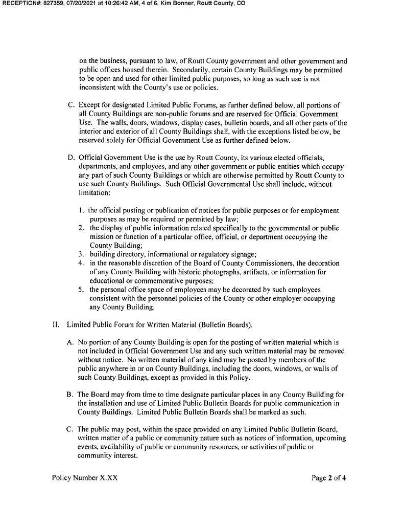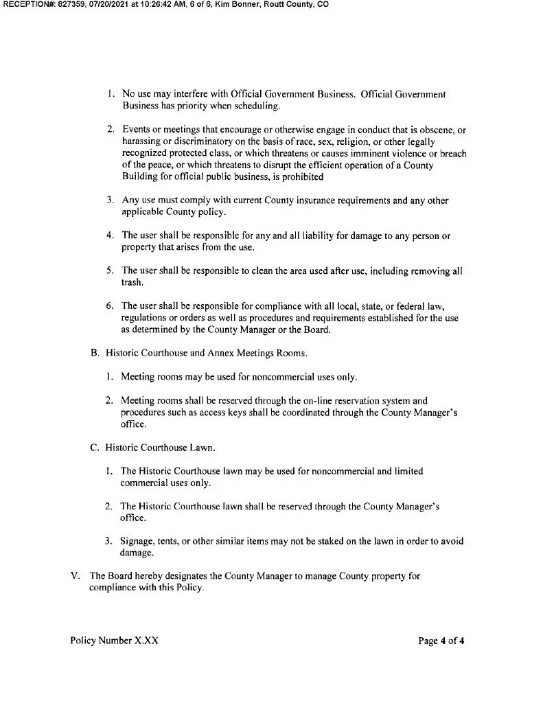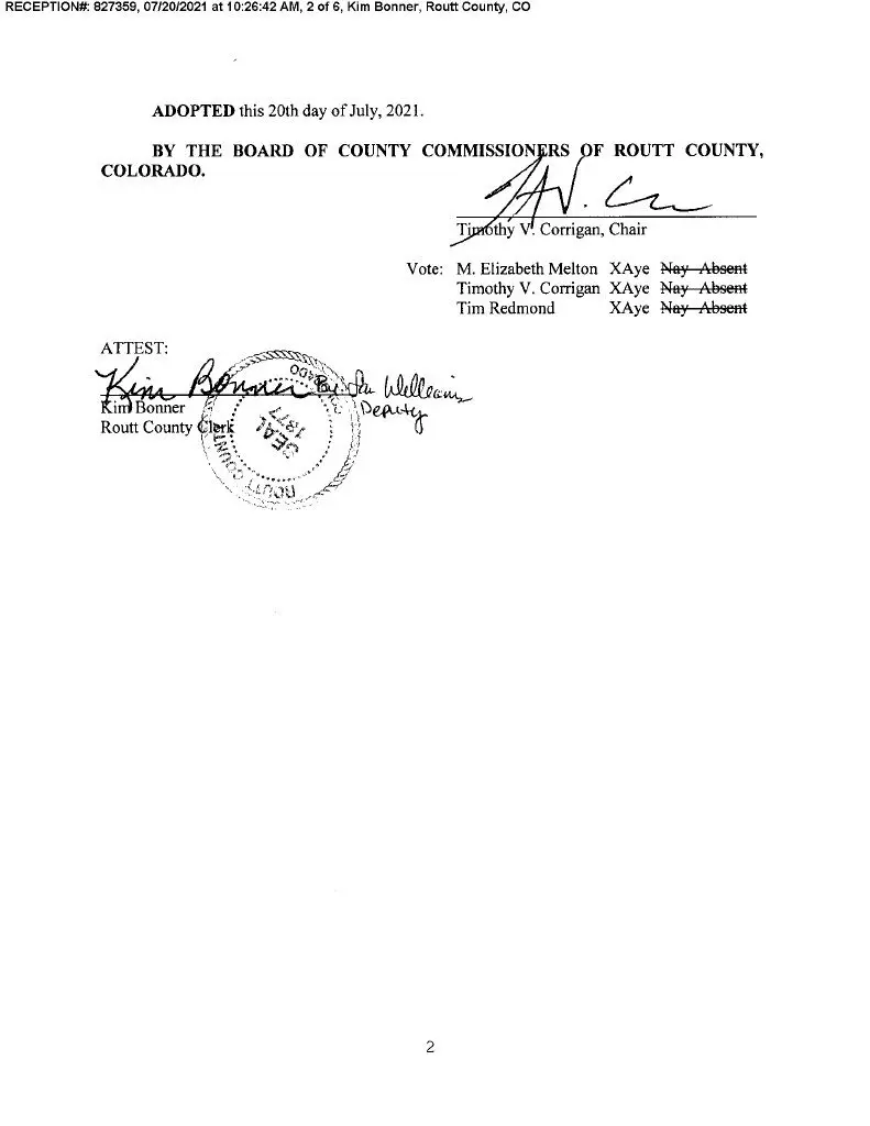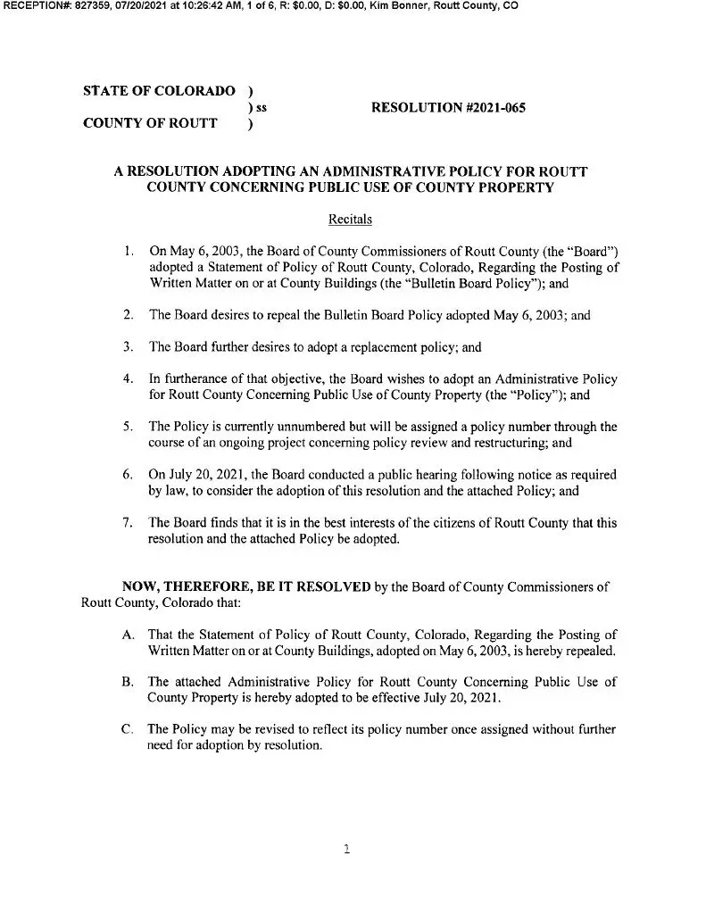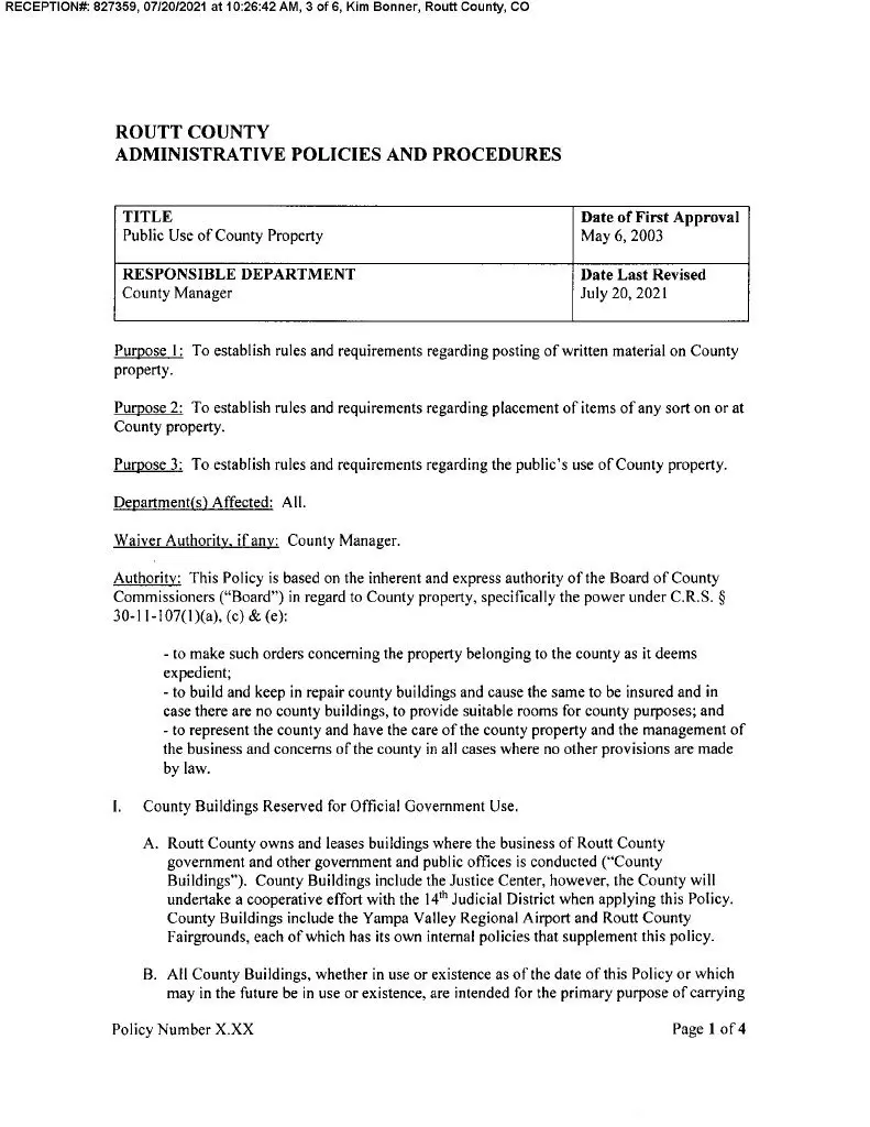 That policy was amended and adopted by Routt County Commissioners Elizabeth Melton, Tim Corrigan, and Tim Redmond on July 20, 2021. (Copied below.)