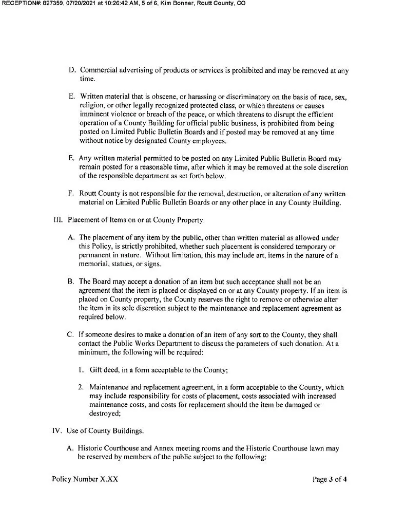 The Routt County Administrative Policies and Procedures states: “The placement of any item by the public, other than written material as allowed under this Policy, is strictly prohibited, whether such placement is considered temporary or permanent in nature. Without limitation, this may include art, items in the nature of a memorial, statues, or signs.”