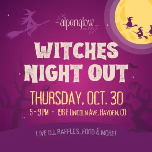 Witches Night Out at Alpenglow — 3rd Annual Gathering of the Spooky Sisterhood! Join us for an evening of Halloween delights, raffles, live music, cauldron cocktails & more. Plus, a best dressed contest, so wear your finest witchy attire. FREE Admission. Food and drink available for purchase. Alpenglow is at 198 E Lincoln Ave, Hayden, CO 81639.