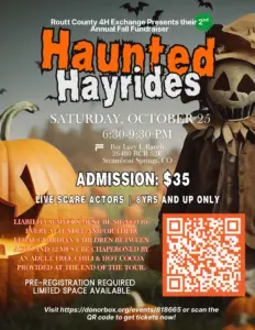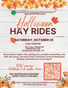 Haunted Halloween Hay Wagon rides are happening at the Bar Lazy L Ranch on Saturday, 26480 RCR 52E just 15 minutes north of Steamboat Springs. The rides are a fall fundraiser for Routt County 4H. The first ride is from 2-5 p.m. for kids. There’s a petting zoo, pumpkin decorating, free chili and hot cocoa. Dress up in your Halloween finest and don’t miss the fun. It’s $20 per person but kids two and under are free.