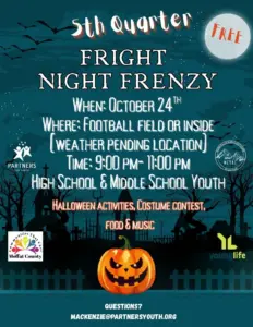 5th Quarter with Partners for Youth presents Fright Night Frenzy. It’s from 9-11 p.m. on Friday, Oct. 24, at the Moffat County High School Football Field. This is for middle school and high school kids. There’s also a costume contest with food and music.
