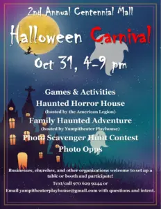 The 2nd annual Halloween Carnival is at Centennial Mall in Craig, from 4-9 p.m. Enjoy a Haunted Horror House and a Family Haunted Adventure with a scavenger hunt and other games and activities. For more information, call 970-629-9244 or email YampaTheaterPlayhouse@gmail.com