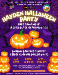 The Hayden Halloween Party is at 6:30 p.m., Thursday, Oct. 23, at the Hayden Center, 495 W. Jefferson Ave. It’s a spooky celebration for ages 12-18, hosted by Hayden Youth Action Council & Queer Futures. Activities include a pumpkin painting contest, best costume, and a free showing of “A Quiet Place,” at 7:15 p.m. The event is free and includes snacks, drinks and fun giveaways. Questions? Text 970-819-1202 or email: sarah@partnersyouth.org
