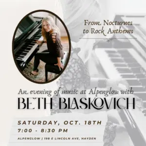 Saturday night is a piano concert from Beth Blaskovich at Alpenglow at the Granary in Hayden. Purchase Tickets here