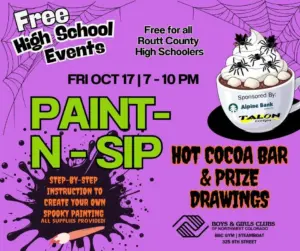 It’s Paint-n-Sip night at the Boys and Girls Club in Steamboat Springs. This is free for all Routt County highschoolers. There’s also a hot cocoa bar and prize drawings. This is in the Boys & Girls Club Gym from 7-10 p.m. Friday night, at 325 8th Street.