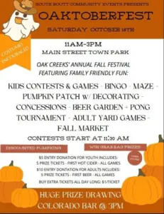 Oak Creek and the South Routt Community presents Oaktoberfest, from 11 a.m. to 3 p.m. Saturday, Oct. 18, in Main Street Town Park. It’s Oak Creek’s annual fall festival featuring family friendly fun. (Kids contests and games, bingo, a maze, pumpkin decorating, concessions, a beer garden, pong tournament, adult yard games, and a fall market.)