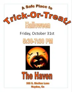 The Haven in Hayden is inviting trick-or-treaters to stop by from 5:30-7:30 p.m. on Halloween. The Haven is at 300 S. Shelton Lane.