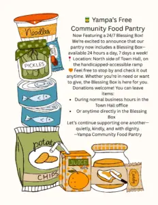 The community of Yampa now has a Free Community Food Pantry and Blessing Box. It’s available 24 hours a day, seven days a week on the north side of Town Hall in Yampa. Take what you need from the Blessing Box, or make a donation in the Town Hall Office.