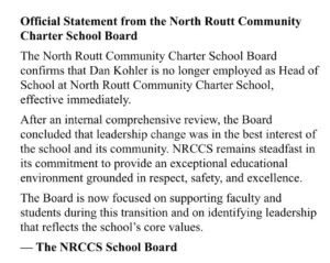 Dan Kohler had been Head of School at NRCCS for three years. He was dismissed by the board Tuesday, Nov. 4, with the following statement this week, “After an internal comprehensive review, the Board concluded that leadership change was in the best interest of the school and its community. NRCCS remains steadfast in its commitment to provide an exceptional educational environment grounded in respect, safety, and excellence.”
