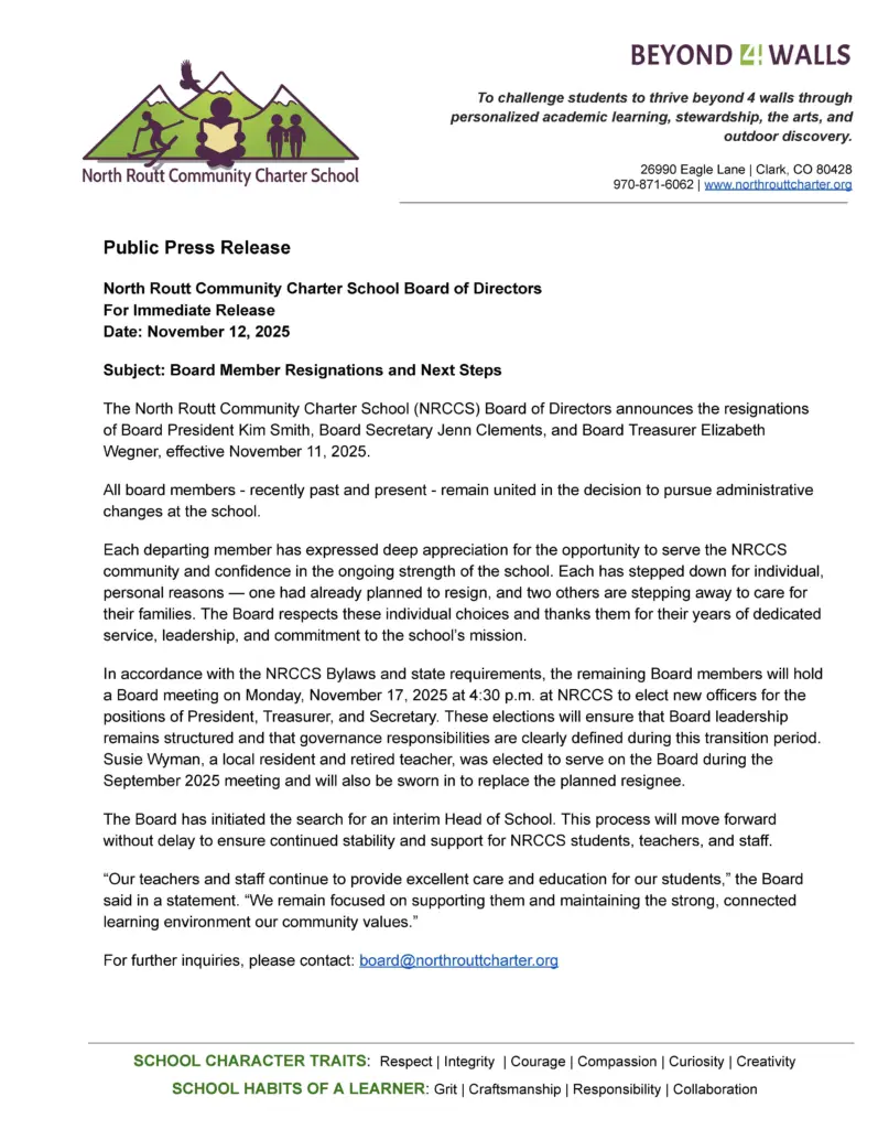 The North Routt Community Charter School (NRCCS) Board of Directors announces the resignations of Board President Kim Smith, Board Secretary Jenn Clements, and Board Treasurer Elizabeth Wegner, effective November 11, 2025.