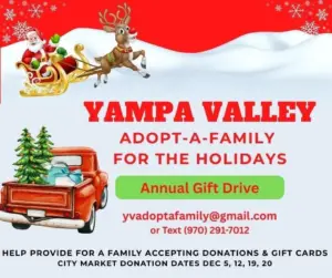 Yampa Valley Adopt-A-Family is happening now for the holidays with donation days scheduled this month at the Steamboat Springs City Market (Dec. 5, 12, 19, and 20). Gift cards are being accepted. If you are a family in need, reach out to: yvadoptafamily@gmail.com or text 970-291-7012.