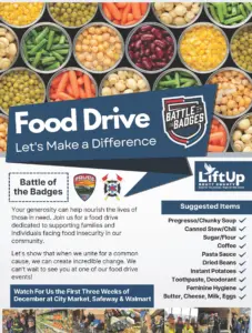 The Battle of the Badges is underway. The Steamboat Springs Police Department (SSPD) and Steamboat Springs Fire Rescue (SSFR) are having a food drive for LiftUp of Routt County. Food and non-perishables and also monetary donations are being collected at Safeway, City Market, and Walmart in Steamboat Springs. Money is also being collected for LiftUp’s Housing and Utility Assistance Programs. A QR code to donate is on the Events Calendar on our website.