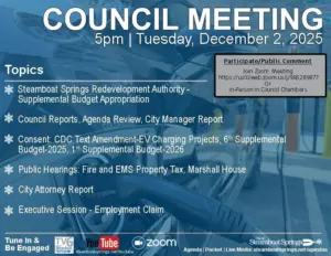 Steamboat Springs City Council meets tonight. Public hearings include a discussion on a property tax for funding Fire and Emergency Medical Services, and a discussion on extending a waiver of temporary storage for the historic Marshall House.