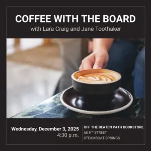 Lara Craig and Jane Toothaker with the Steamboat Springs Board of Education will be at Off the Beaten Path Bookstore at 4:30 p.m. today (Wednesday, December 3). You’re invited to stop by and say hello.