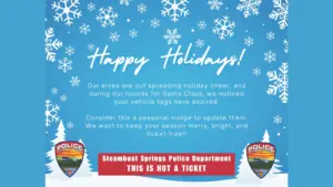 Steamboat Springs Police officers are looking for expired vehicle registration tags. No tickets right now, but you will get a festive, holiday-themed reminder on your windshield, to get it done.