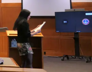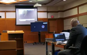 The recording of the 911 call was the first piece of evidence presented by the District Attorney. The address of where the stabbing happened has been redacted. (Recorded with a cell phone in the courtroom, with permission of the court.)