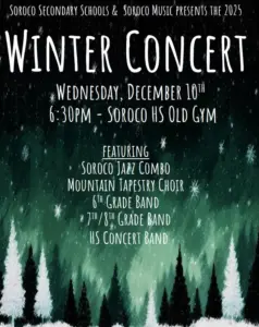 The Winter Concert for SoRoCo Secondary Schools and Soroco Music is at 6:30 p.m. Wednesday, Dec. 10, in the old gym at SoRoCo High School.