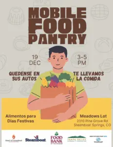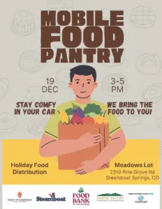 Those needing food for the holiday season can receive some food at a Pop-up Mobile Food Pantry Friday afternoon. It’s organized through Steamboat Ski & Resort Corp., in collaboration with Food Bank of the Rockies, Boys & Girls Club of Northwest Colorado, Heart of Steamboat Church, and Yampa Valley Community Foundation. All community members are invited to drive by and get food, from 3-5 p.m. Friday afternoon in the Meadows parking lot in Steamboat Springs.