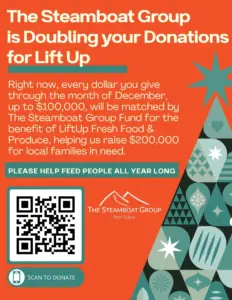 The Steamboat Group is rallying the community to Double Your Donation to support LiftUp, before the end of the year. The goal is to raise $200,000, half of which will be matched by The Steamboat Group. Much of it will be used for the LiftUp Fresh Produce account. Checks can be made out to The Steamboat Group Fund or through the Yampa Valley Community Foundation at YVCF.org/TSG