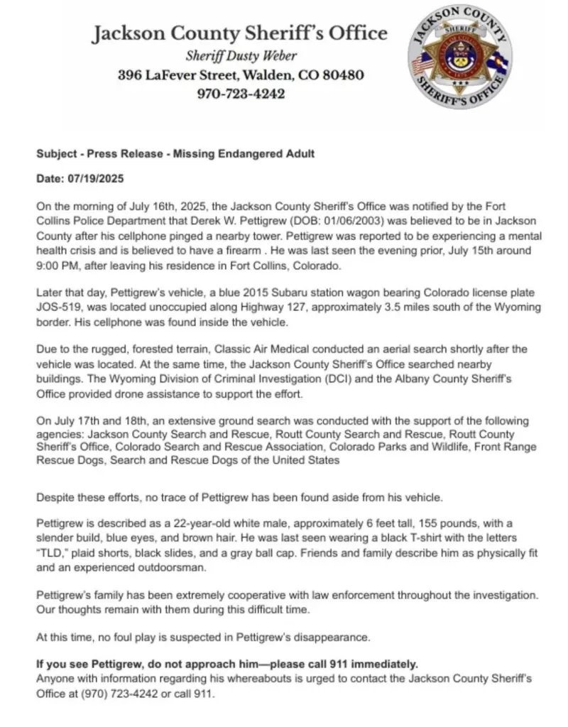 22-year-old Derek Pettigrew, who grew up in Steamboat Springs went missing last July. His car was found a few miles from the Wyoming border, in Jackson County. Search teams, including Routt County Search and Rescue spent at least three days searching the area. Pettigrew was never found.