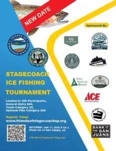 The date for the Friends of Stagecoach Ice Fishing Tournament has been changed to Jan. 17, due to concerns about the ice on Stagecoach Reservoir at Stagecoach State Park in Oak Creek. The tournament is limited to the first 300 participants. The cost is $40 and there will be cash prizes. Register through www.FriendsofStagecoachSP.org