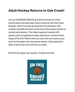 Adult Hockey is returning to Oak Creek. It’s at 8:30 p.m. on Thursday nights, starting Jan. 8, and runs until the ice melts. It’s $10-15 per session and goalies are free. Reach out to Mark Stepp (970-819-1939) for details.