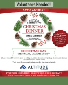 The 38th Annual Realtor Community Christmas dinner is from 1-5 p.m. on Thursday, Christmas Day, at the Steamboat Springs Community Center. It’s free and all are invited. Food and volunteers are still needed for the annual event. For questions, or to donate food, call 970-819-2034.